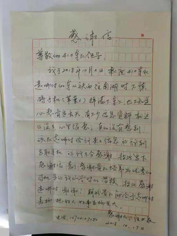 5.2018年10月16日,汪先生乘坐410線2061號駕駛員趙正博師傅車從鐵西往南湖走時,不慎將手機掉到了車里,下車后,汪先生很是著急,因為手機內有不少信息,正在焦急中,趙師傅拾到他的手機給他的家人去了信息,并把手機交到410線調度室,汪先生帶著表揚信來到調度室,調度及時把手機還給了失主,汪先生連連感謝,感謝貴公司培養(yǎng)出這樣優(yōu)秀的駕駛員。