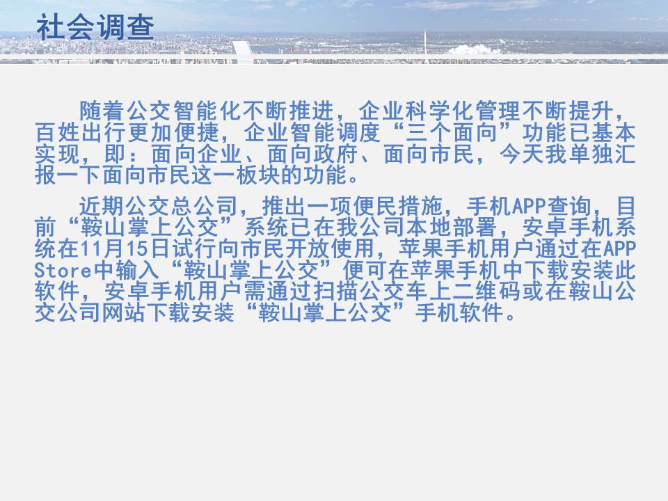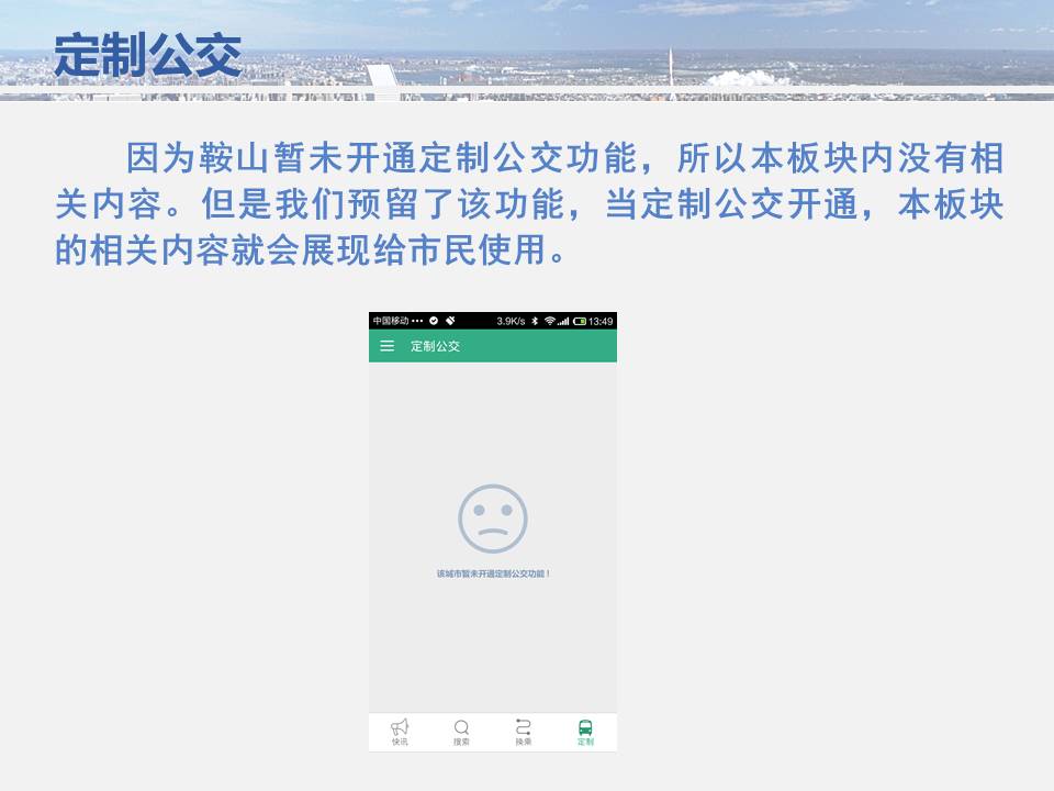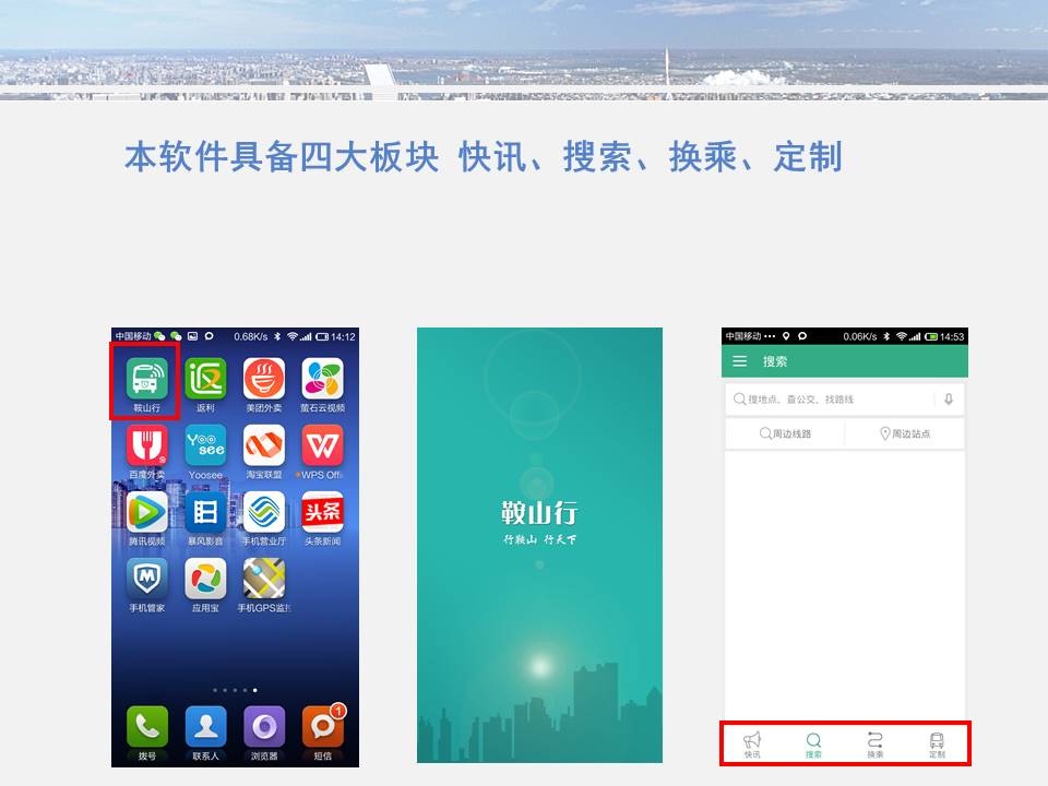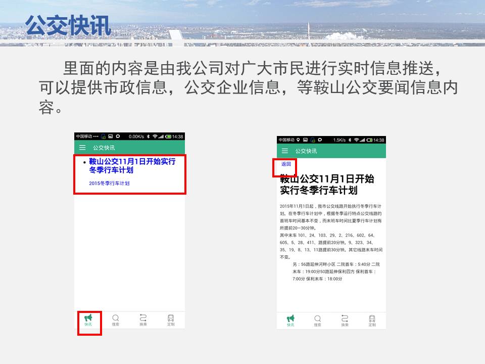 點點手機就可以看到公交車目前所在的位置,精準地掐好出門時間,從而避免在惡劣天氣或高峰期苦苦候車,工作人員坐在調(diào)度室內(nèi)就能掌握車輛在路上的運行情況……為方便廣大市民出行,基于安卓平臺開發(fā)的“鞍山掌上公交”官方APP將于11月15日正式上線試運行,適用于蘋果IOS系統(tǒng)的APP將于明年初上線,市民可在公共交通總公司官網(wǎng)下載該軟件,并實現(xiàn)37條公交線路車輛實時查詢的便利服務。